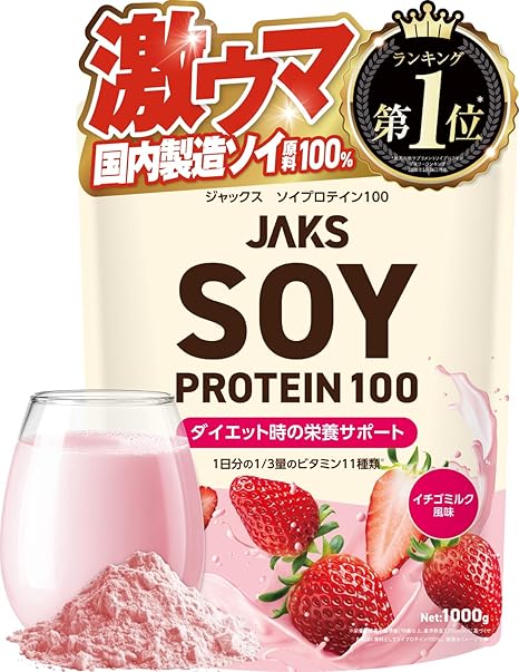 【溶けやすい】 ジャックス JAKS ソイプロテイン 1kg (国産大豆たんぱく原料使用) おいしい 国内製造 ダイエット 1食分のビタミン11種類 オールインワン配合 SOY 高たんぱく質 粉末 大豆たんぱく ダマになりにくい (1kg, イチゴミルク)
